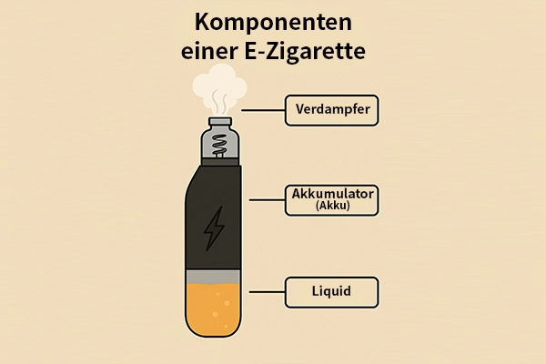 - E-Liquid – Die Flüssigkeit, die Nikotin, Aromen und eine Trägerflüssigkeit enthält. Diese wird verdampft, um den inhalierbaren Dampf zu erzeugen.